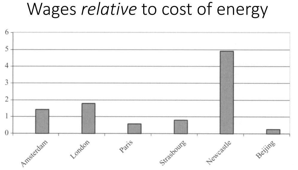 What is more likely, is that 18th-century Britain possessed some necessary requirements in terms of resources, mixed with general socioeconomic conditions. And here we come to Allen’s wage hypothesis. There, Robert C. Allen argues that extremely high wages in Britain, and low coal prices, created a big incentive for labor replacement.2 It is also possible to pinpoint the exact location based on these 2 factors alone. That location being Newcastle.